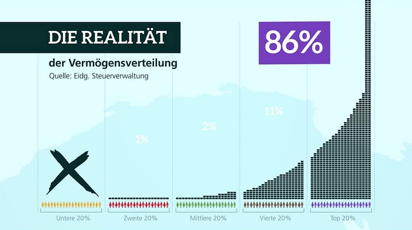 Im Gegensatz dazu besitzen 55.9 Prozent aller Schweizer weniger als 55’000 Franken gesamthaft besitzen diese Schweizer 1.6% des Gesamtvermögens.